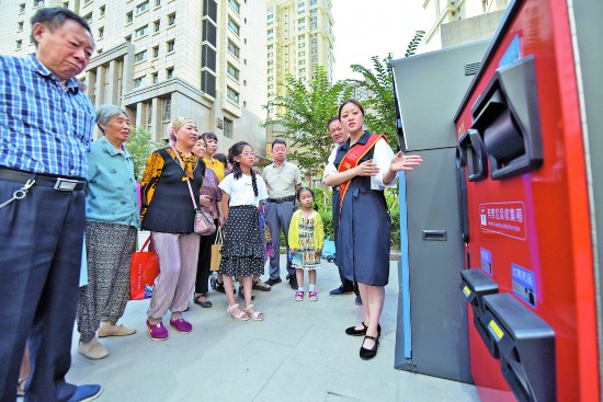 圖③:7月7日,社區(qū)垃圾分類志愿者向居民介紹智能垃圾分類回收設(shè)備。