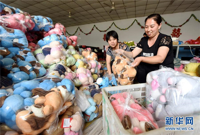 7月9日,河北臨城縣辛安莊村村民在當(dāng)?shù)匾?ldquo;扶貧車間”內(nèi)包裝加工好的毛絨玩具。 新華社記者 朱旭東 攝