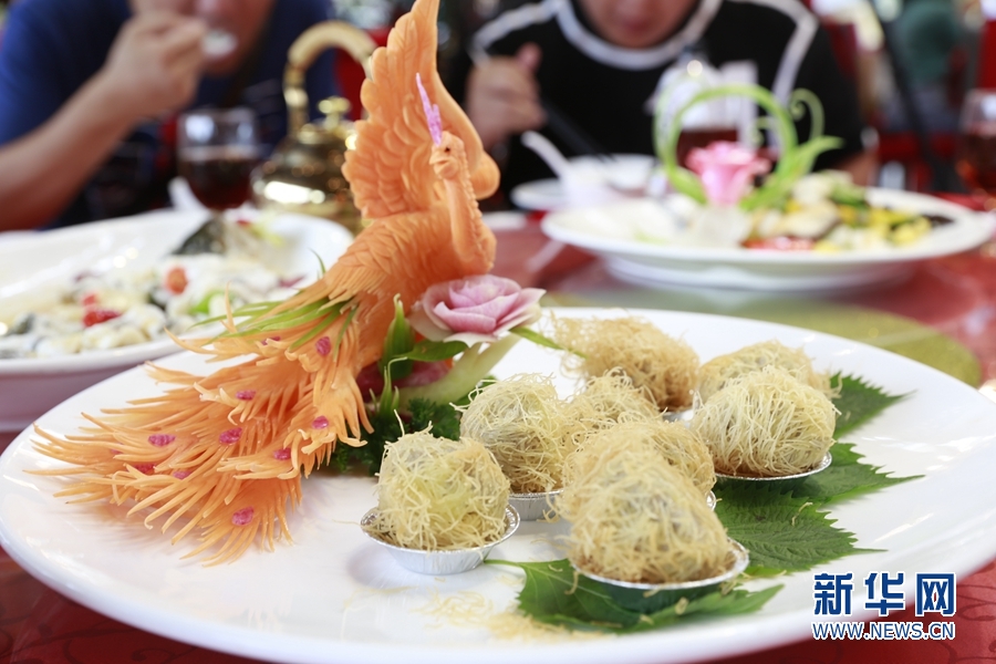 本次荔枝宴共有泮塘綠叢荔荷雞、魚潛荔水芳四溢,以及禾桿藏珠荔香透等10道菜肴。新華網(wǎng) 林曉蕾攝