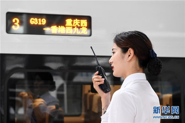 7月11日,乘務(wù)員在G319次列車上做發(fā)車前的準(zhǔn)備工作。當(dāng)日,重慶至香港直達(dá)高鐵正式開通,此次首發(fā)的G319次復(fù)興號列車運行速度350km/h,沿途經(jīng)停遵義、貴陽東、桂林西、肇慶東、廣州南和深圳北站。列車由重慶西站至香港西九龍站全程運行需7小時37分鐘,全程票二等座票價為660元。目前內(nèi)地與香港聯(lián)通的高鐵車站已增加到58個。新華社記者唐奕攝