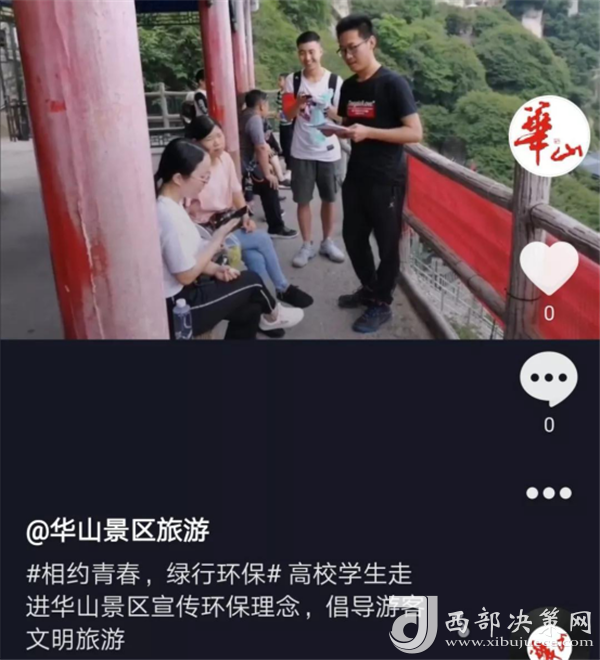 活動(dòng)還通過(guò)高校網(wǎng)絡(luò)紅人拍攝抖音“青春最美,華山見證”主題短視頻等傳播方式,在網(wǎng)絡(luò)線上形成熱度,為華山綠色環(huán)保游提供了新方式。