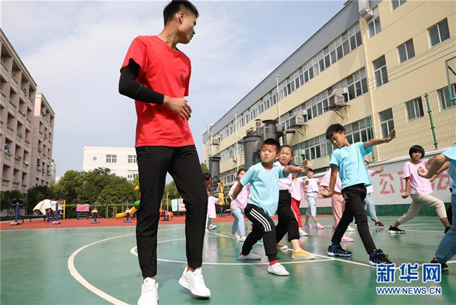 “小候鳥”們在武術(shù)課前做熱身運動(7月15日攝)。