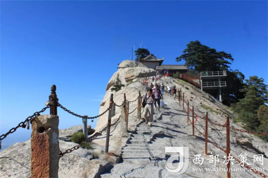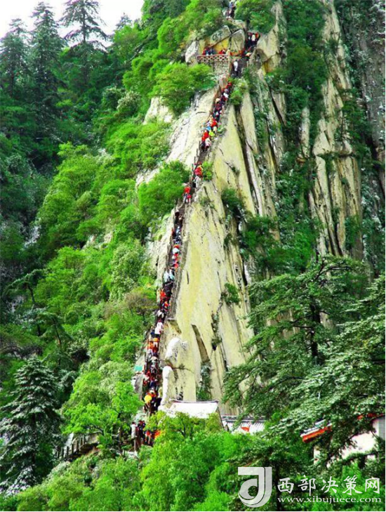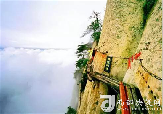 在萬仞絕壁上鑲嵌石釘搭木椽而筑,棧道上下皆是懸崖絕壁,鐵索橫懸,游人至此,面壁貼腹,屏氣挪步,被譽(yù)為“華山第一天險”。
