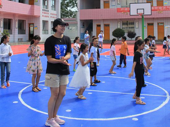 清華大學(xué)“19黔行”支教隊員和小朋友們一起做課間操。鄔雄亮/攝