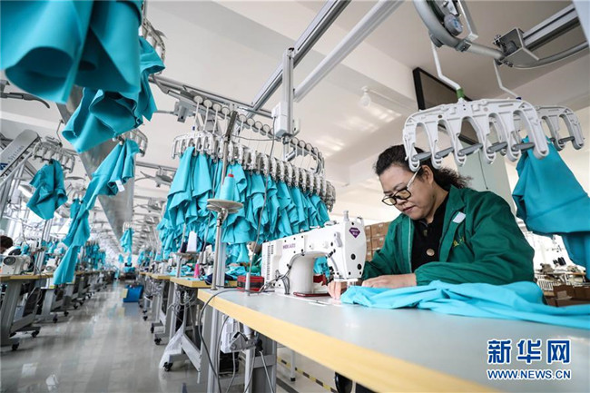 3月6日,工人在葫蘆島益豐(集團(tuán))運動服飾有限公司生產(chǎn)車間加工泳衣。新華社記者 潘昱龍 攝