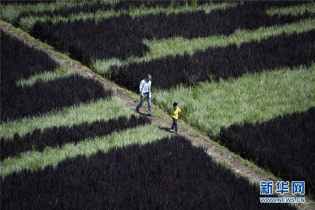 8月18日,游客在新疆察布查爾錫伯自治縣納達(dá)齊牛錄鄉(xiāng)稻田畫基地游覽。