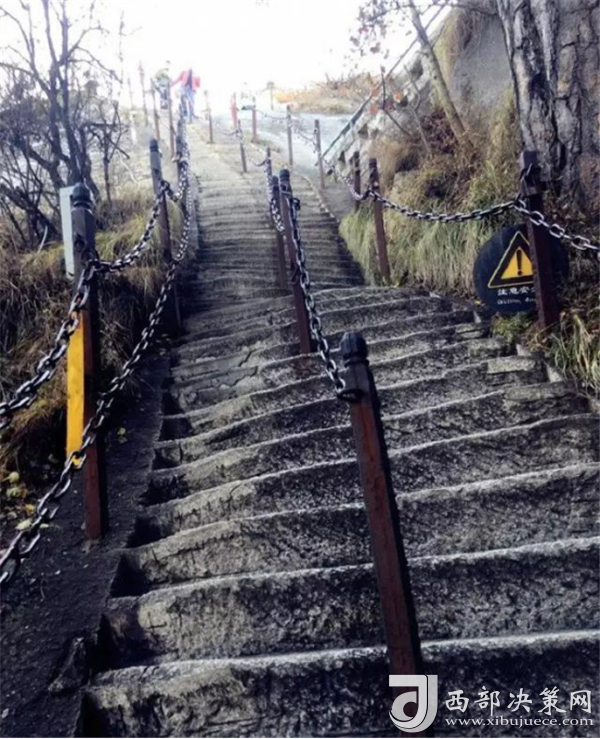 在從南峰到東峰的山路上還有兩處景點(diǎn):一是"避詔崖",著名道士陳摶,為躲避皇帝征召曾避居此處的山洞中;另一處是絕壁千丈而不見底的長空棧道,棧道依懸崖開鑿,游人需手扶鐵索木欄而過,是華山上又一險(xiǎn)處。