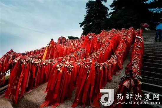 金鎖關(guān)是建在三峰口的一座城樓般石拱門,是經(jīng)五云峰通往東、西、南、中四峰的咽喉要道,鎖關(guān)后則無路可通,所以又稱為通天門。關(guān)內(nèi)關(guān)外登山路兩側(cè)鐵索上掛滿的情侶鎖、平安鎖重重疊疊,紅繩彩線迎風(fēng)搖曳,也是關(guān)前一道美麗的風(fēng)景。