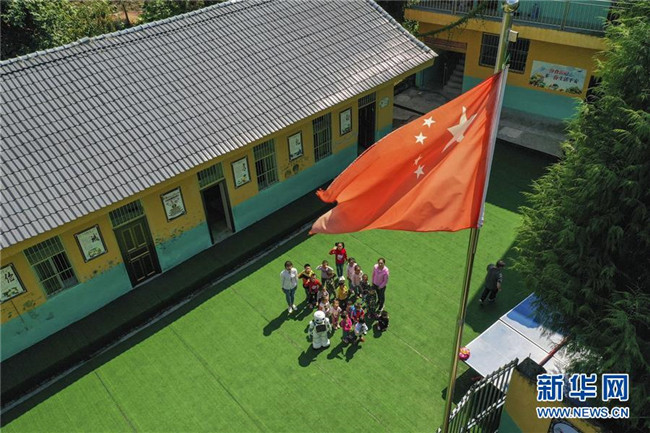 在城口縣蓼子鄉(xiāng)第一中心小學(xué)附屬的鄉(xiāng)村小學(xué)蓮花小學(xué)的開學(xué)典禮上,機器人老師和孩子們參加升國旗儀式(9月2日無人機拍攝)。 新華社記者 劉潺 攝