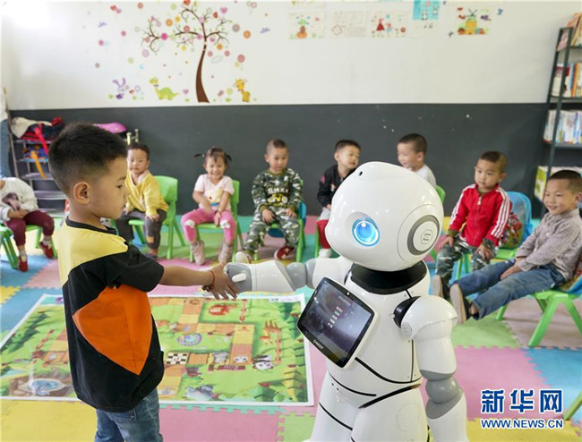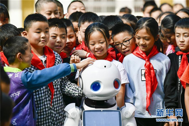 9月2日,在城口縣蓼子鄉(xiāng)第一中心小學(xué)開學(xué)典禮上,機器人老師在和孩子進行互動交流。 新華社記者 劉潺 攝