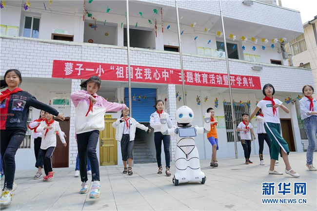 9月2日,在城口縣蓼子鄉(xiāng)第一中心小學(xué)開學(xué)典禮上,機器人老師和孩子們一起跳舞。 新華社記者 劉潺 攝