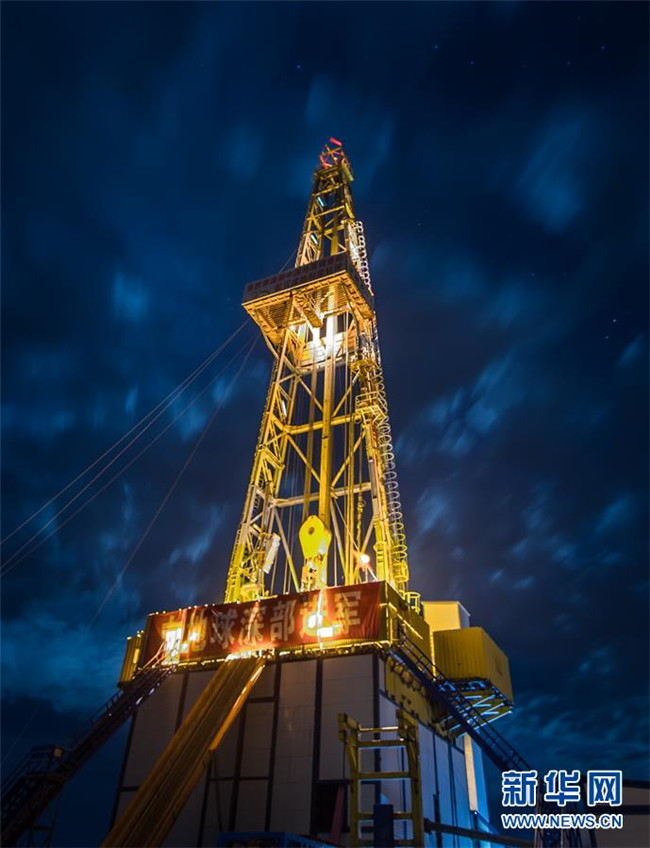 夜幕下的“地殼一號”萬米鉆機(jī)整機(jī)系統(tǒng)(2018年6月1日攝)。2018年6月2日,吉林大學(xué)主要承擔(dān)研發(fā)的“地殼一號”萬米鉆機(jī)正式宣布完成“首秀”:完鉆井深7018米,創(chuàng)造了亞洲國家大陸科學(xué)鉆井新紀(jì)錄,標(biāo)志著我國成為繼俄羅斯和德國之后,世界上第三個(gè)擁有實(shí)施萬米大陸鉆探計(jì)劃專用裝備和相關(guān)技術(shù)的國家。 新華社記者 許暢 攝