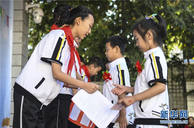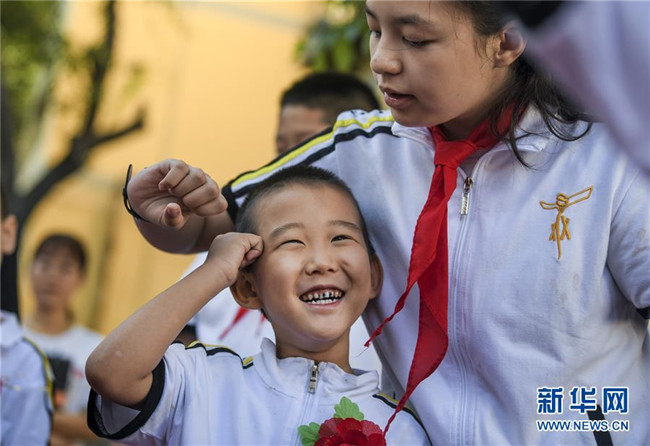 9月4日,新疆教育學(xué)院實驗小學(xué)校園內(nèi),一年級新生在六年級學(xué)生的指導(dǎo)下學(xué)習(xí)握拳宣讀誓言。