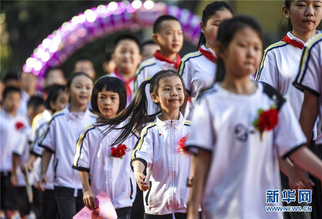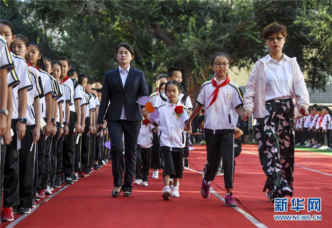 新學(xué)年伊始,新疆教育學(xué)院實驗小學(xué)舉辦主題為“夢想從這里啟航”的開學(xué)典禮,一年級新生在六年級學(xué)生的引領(lǐng)下培養(yǎng)愛學(xué)校、愛師長、愛學(xué)習(xí)的品德,走進(jìn)校園開啟新生活。 新華社記者 王菲 攝