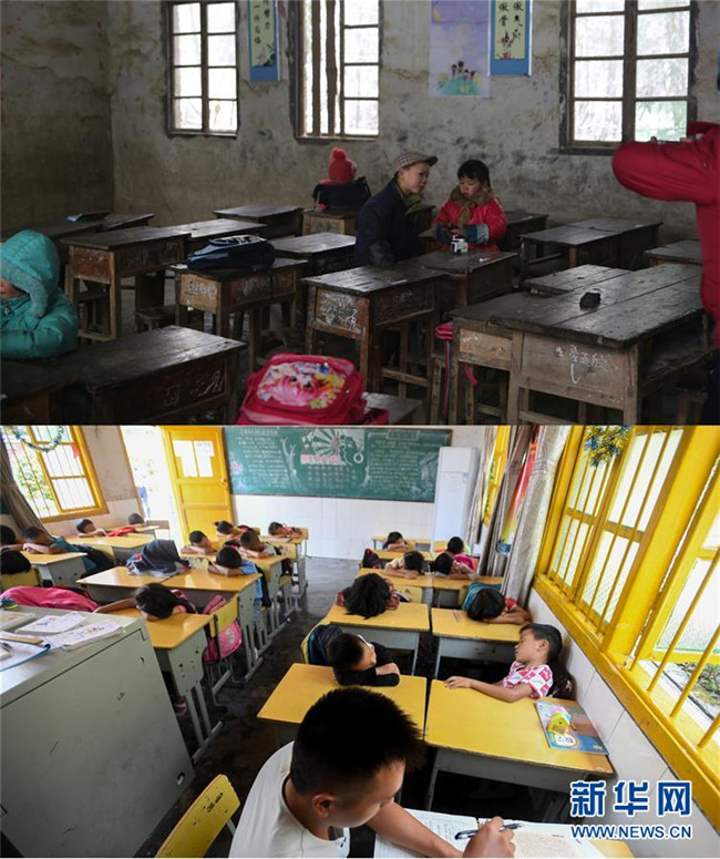 這是一張拼版照片。上圖:2014年2月14日拍攝的改造前的十八洞小學(xué)教室(資料照片);下圖:十八洞小學(xué)學(xué)生在改造后的教室睡午覺,老師(前)在一旁備課(9月5日新華社記者陳澤國攝)。新華社發(fā)