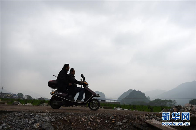 在廣西灌陽縣洞井瑤族鄉(xiāng),桂平巖小學(xué)老師趙仁斌(前)用電單車將楊大杰老師載去學(xué)校的路上(2016年3月24日攝)。2015年3月,楊大杰被診斷為股骨頭壞死,經(jīng)過一段時(shí)間治療病情有所緩解后,他堅(jiān)持帶病回到教學(xué)崗位上。新華社記者 陸波岸 攝