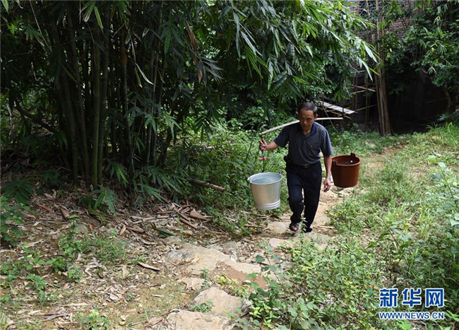 在廣西天等縣進(jìn)結(jié)鎮(zhèn)愛樂村龍坡屯,龍坡教學(xué)點(diǎn)老師黃明料在教學(xué)點(diǎn)附近農(nóng)家挑水回學(xué)校給學(xué)生做午飯(2015年9月10日攝)。新華社記者 陸波岸 攝