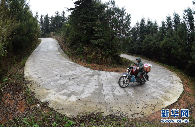 在廣西灌陽縣洞井瑤族鄉(xiāng),野豬殿村小學(xué)老師周運(yùn)雄在采購學(xué)生營養(yǎng)餐食材后騎行在回學(xué)校的路上(2016年3月23日攝)。新華社記者 陸波岸 攝