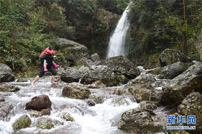 在廣西灌陽縣洞井瑤族鄉(xiāng)野豬殿村,野豬殿村小學(xué)老師周運(yùn)雄放午學(xué)后背著一名學(xué)生走過被流水淹沒的路段回家(2016年3月22日攝)。新華社記者 陸波岸 攝
