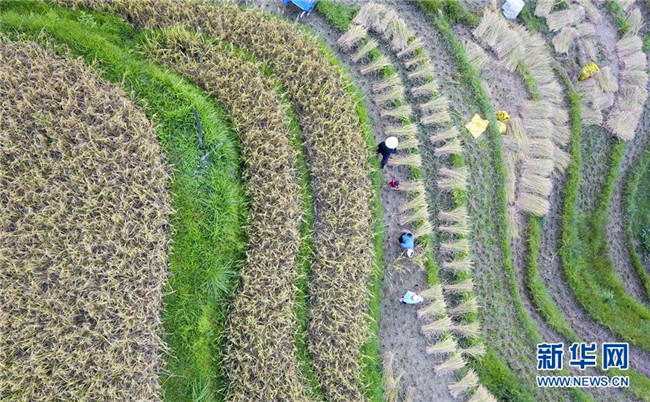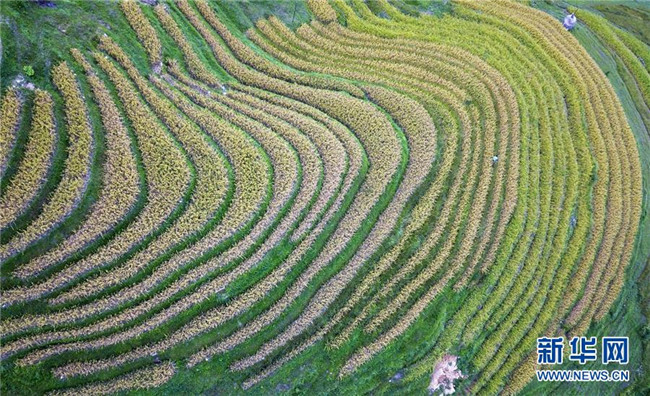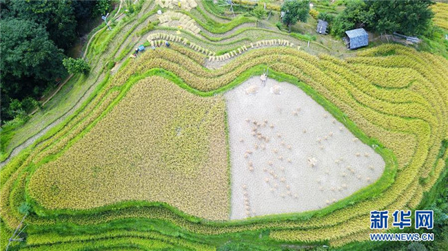 近日,貴州省黔東南苗族侗族自治州榕江縣計劃鄉(xiāng)計劃村陽開苗寨的水稻陸續(xù)成熟,農民們搶抓農時收割稻谷。從空中俯瞰,層層疊疊的梯田線條分明,與古樸的苗寨木樓相互映襯,美不勝收。 新華社記者 楊文斌 攝