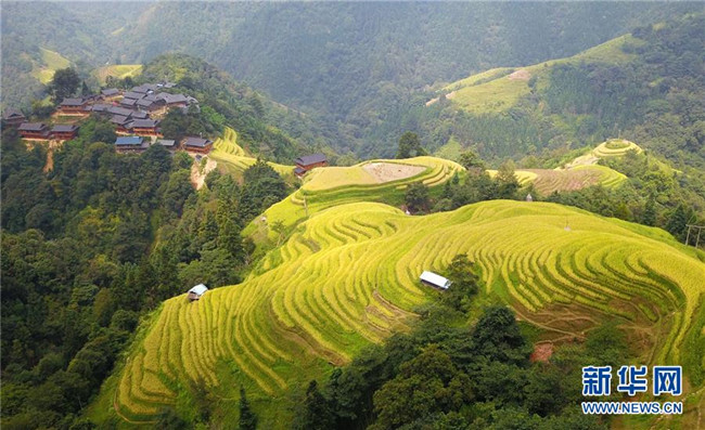 這是9月17日無人機拍攝的貴州省榕江縣計劃鄉(xiāng)計劃村陽開苗寨梯田。