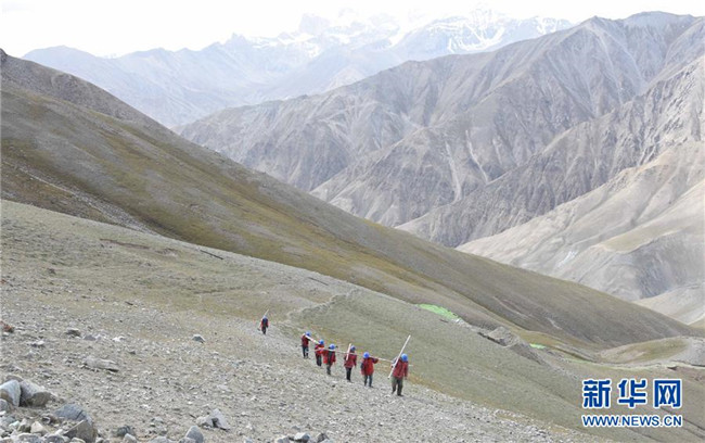 工人在喀喇昆侖山脈上為馬爾洋鄉(xiāng)輸電工程運送鋼管(9月7日攝)。 新華社記者 杜剛 攝