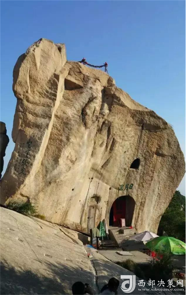 華山以石著名,每一處奇石都有一個美麗而動人的傳說。過了擦耳崖,看到的這兩塊石頭叫“日月巖”,左邊的代表“日”,右邊的代表“月”,上面這四個字是“云天弧光”,有時在夜晚,這里會出現(xiàn)一道非常耀眼的光。相傳武則天當(dāng)年上華山走這里,看到這兩塊形似日月的石頭,就別出心栽地給自個兒的字號創(chuàng)造了一個“瞾”字,因為這兩塊奇石上頂青天,下臨空谷,唯我獨尊,是光明與權(quán)威的象征。