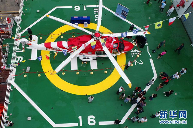 10月14日,“雪龍2”號向深圳市民開放。這是市民在參觀“雪龍2”號新配備的“雪鷹301”直升機(無人機拍攝)。新華社記者 劉詩平 攝