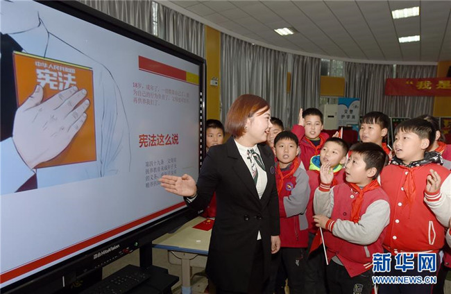 安徽省合肥市經(jīng)開區(qū)明珠居委會法律援助律師在給明珠小學(xué)的學(xué)生們講解憲法知識(2018年12月3日攝)。 新華社記者 郭晨 攝