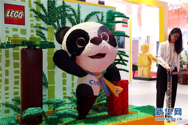 11月3日,在品質(zhì)生活展區(qū)的樂高展臺,用積木搭成的進博會吉祥物熊貓“進寶”已安裝就緒。新華社記者劉穎攝