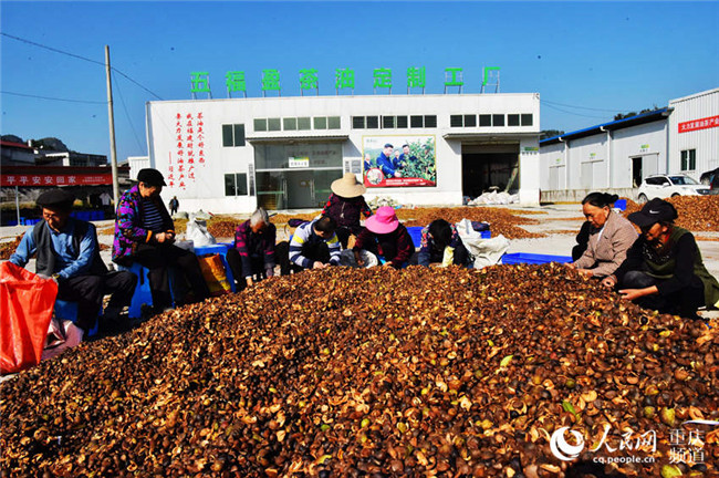 1月3日,在重慶市酉陽土家族苗族自治縣五福鎮(zhèn)的五福盈茶油定制工廠,工人們正忙著晾曬油茶籽,整個廠區(qū)一片繁忙景象。近年來,該縣采取“生態(tài)+產(chǎn)業(yè)”模式在荒山上開發(fā)的上萬畝油茶已陸續(xù)豐收,油茶產(chǎn)業(yè)成為當?shù)剞r民脫貧致富產(chǎn)業(yè)之一。