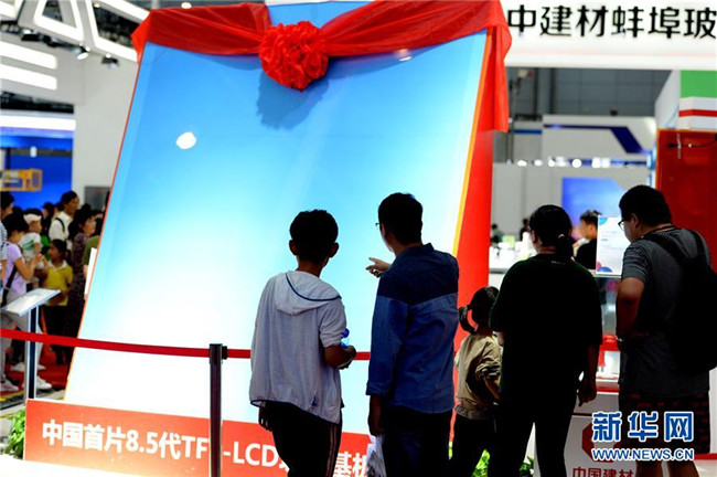觀眾在2019世界制造業(yè)大會上參觀中國首片8.5代TFT-LCD玻璃基板(9月22日攝)。 新華社發(fā)(黃博涵攝)