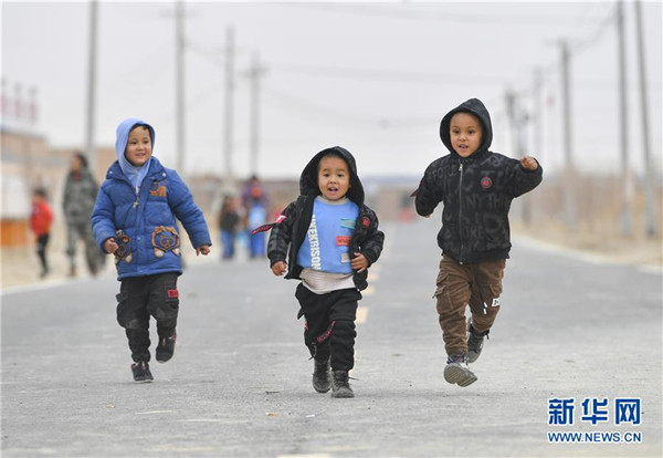 11月18日,幼兒園大班的小朋友放學(xué)后走在于田縣達(dá)里雅布依鄉(xiāng)易地扶貧搬遷安置點(diǎn)的硬化道路上。新華社記者胡虎虎攝
