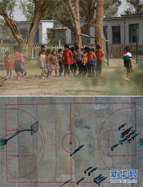 拼版照片:上圖為學(xué)生利用課間時(shí)間在平整易地扶貧搬遷前的校園操場(2018年9月6日攝);下圖為學(xué)生們在于田縣達(dá)里雅布依鄉(xiāng)易地扶貧搬遷安置點(diǎn)的水泥操場上打籃球(2019年11月19日無人機(jī)拍攝)。新華社記者胡虎虎攝