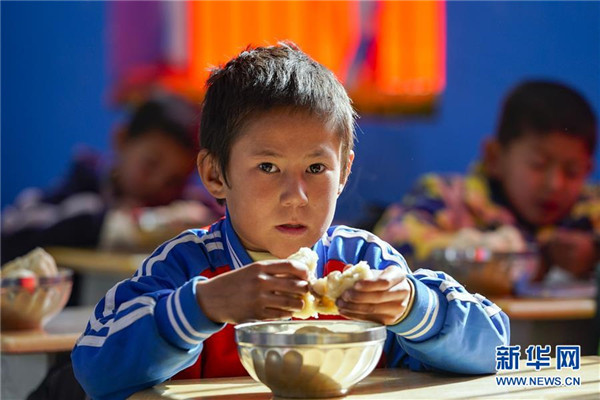 11月19日,在新疆于田縣達(dá)里雅布依鄉(xiāng)易地扶貧搬遷安置點(diǎn)的新學(xué)校,一年級(jí)學(xué)生在學(xué)校里吃免費(fèi)午餐。新華社記者沈伯韓攝