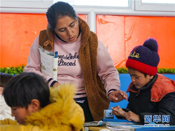 11月19日,在新疆于田縣達(dá)里雅布依鄉(xiāng)易地扶貧搬遷安置點(diǎn)的新學(xué)校,數(shù)學(xué)老師艾比拜木·吾布力艾山(中)在輔導(dǎo)一年級(jí)學(xué)生做計(jì)算題。新華社記者沈伯韓攝