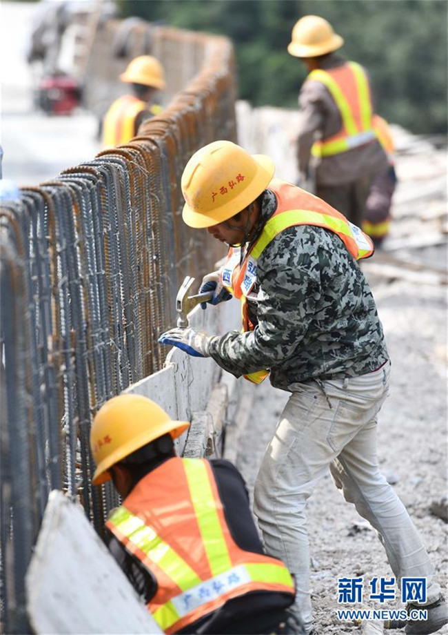 11月19日,在廣西融水苗族自治縣四榮鄉(xiāng),工人在羅融二級公路建設(shè)現(xiàn)場施工。 新華社記者 黃孝邦 攝