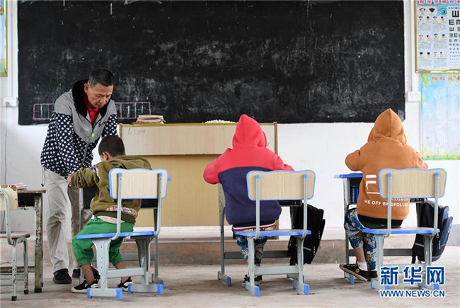 11月19日,在廣西上思縣那琴鄉(xiāng)中心小學(xué)逢通村教學(xué)點(diǎn),梁志雄給學(xué)生上課。新華社記者陸波岸攝