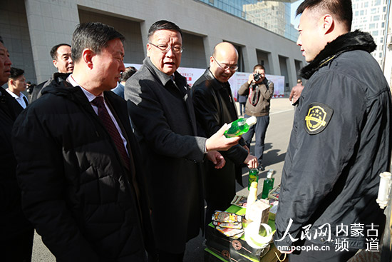 內蒙古市場監(jiān)督管理局局長白清元查看現(xiàn)場展示的假冒偽劣商品。