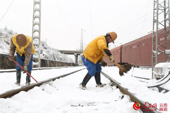 12月5日,云南省滇東北迎來(lái)今年以來(lái)首場(chǎng)降雪。昆鐵曲靖工務(wù)段及時(shí)啟動(dòng)大雪天氣應(yīng)急預(yù)案,成立除雪打冰隊(duì),加強(qiáng)道岔除雪除冰工作。攝影:楊永全
