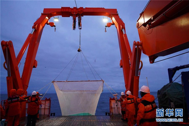 “雪龍2”號(hào)12月7日離開(kāi)南大洋普里茲灣海域向西航行,開(kāi)始對(duì)宇航員海海域展開(kāi)科考作業(yè)??瓶缄?duì)員沿著本次宇航員??瓶嫉氖讉€(gè)調(diào)查斷面,自北向南做了多個(gè)站位的CTD(海水溫鹽深測(cè)量?jī)x)采水作業(yè)、浮游生物垂直拖網(wǎng)作業(yè),以及魚類拖網(wǎng)和箱式采樣器等采樣作業(yè)。
