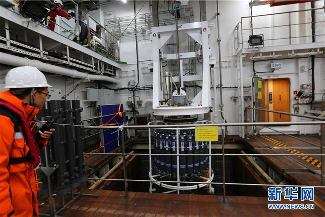 12月9日,科考隊(duì)員首次利用“雪龍2”號(hào)月池系統(tǒng)進(jìn)行CTD采水作業(yè)。 新華社記者 劉詩(shī)平 攝