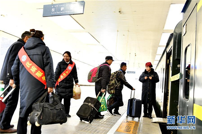 12月23日,拉薩火車站工作人員協(xié)助務(wù)工人員登車。新華社記者 張汝鋒 攝
