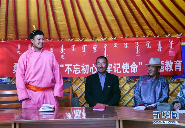 2019年10月11日,在內(nèi)蒙古自治區(qū)正藍旗恩克寶力格嘎查黨員中心戶的蒙古包中,黨員敖日格勒(左一)在回答知識競賽問題。新華社記者 劉磊 攝