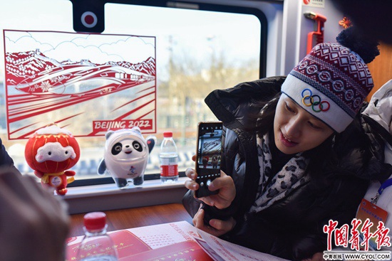 一名乘客正在拍攝2022年北京冬奧會吉祥物和車窗上的窗花。這些剪紙窗花是由張家口蔚縣剪紙藝人創(chuàng)作,包含了詹天佑畫像、京張高鐵和冰雪運動等元素。實習生 宋欣然/攝