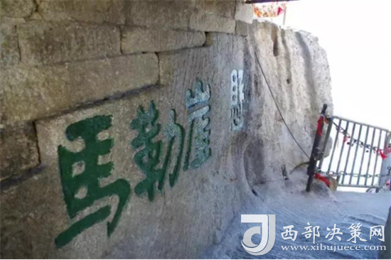 華山長空棧道上下皆是懸崖絕壁,鐵索橫懸,由條石搭成尺許路面,下由石柱固定。由于棧道險峻,故當?shù)厝擞?ldquo;小心九厘三分,要尋尸首,洛南商州”之說。這里只是探險之道,并非登山必由之路,膽小人就在升表臺看看也就行了。所以在長空棧道的入口處,就有這樣一塊石刻,上邊刻著“懸崖勒馬”四個大字。懸崖勒馬的字面意思就是說在高高的山崖邊上勒住馬。比喻到了危險的邊緣及時清醒回頭。面對長空棧道這樣險峻的地勢,游人確實要比正常情況下更加清醒。