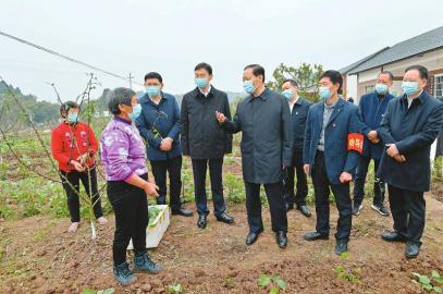 春回大地,正是春耕好時(shí)節(jié)。黎明村村民搶抓農(nóng)時(shí),有的在翻耕土地,有的正給田間作物澆水施肥,有的在播種早春玉米,一片忙碌景象。彭清華走進(jìn)村口的花椒基地,與套種茄子秧苗的村民親切交談,詢問(wèn)栽種面積、土壤墑情、生長(zhǎng)周期、市場(chǎng)銷路等情況。他說(shuō),一年之計(jì)在于春,切實(shí)抓好春耕生產(chǎn)對(duì)于實(shí)現(xiàn)全年豐產(chǎn)豐收意義重大。農(nóng)時(shí)不等人,要在嚴(yán)格落實(shí)防控措施的同時(shí),及時(shí)推進(jìn)春季農(nóng)業(yè)生產(chǎn)和生豬恢復(fù)生產(chǎn),因地制宜調(diào)整種養(yǎng)業(yè)結(jié)構(gòu),確保穩(wěn)產(chǎn)保供和農(nóng)民持續(xù)增收。有關(guān)部門(mén)要繼續(xù)做好服務(wù)保障,加強(qiáng)技術(shù)指導(dǎo),強(qiáng)化農(nóng)資儲(chǔ)備、調(diào)劑和配送,搞好產(chǎn)銷銜接,讓生產(chǎn)資料進(jìn)得來(lái)、農(nóng)產(chǎn)品賣(mài)得出。對(duì)隔離觀察群眾要做好生產(chǎn)扶持工作,幫助他們克服困難、不誤農(nóng)時(shí)。