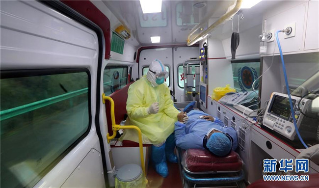駐守在咸寧中心醫(yī)院的云南醫(yī)療隊醫(yī)療二組組長李波趕赴嘉魚縣人民醫(yī)院,轉(zhuǎn)運一名新冠肺炎臨床診斷病例(2月21日攝)。新華社發(fā)(楊崢 攝)