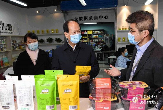 3月12日,自治區(qū)黨委書記、人大常委會(huì)主任石泰峰在呼和浩特市賽罕區(qū)金橋電子商務(wù)產(chǎn)業(yè)園,了解入駐企業(yè)經(jīng)營(yíng)情況。內(nèi)蒙古日?qǐng)?bào)社融媒體記者 袁永紅 攝