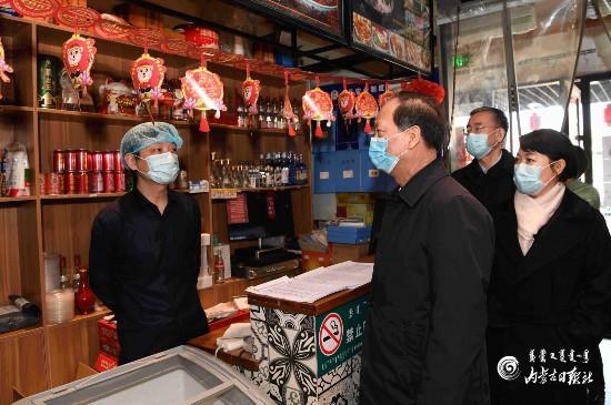 3月12日,自治區(qū)黨委書記、人大常委會(huì)主任石泰峰隨機(jī)走進(jìn)一家臨街餐館,檢查防疫措施,詢問員工返崗和營(yíng)業(yè)情況。 內(nèi)蒙古日?qǐng)?bào)社融媒體記者 袁永紅 攝